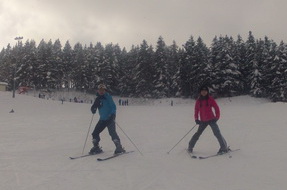 Clients enjoying a Private (Level 1) 2 Person Ski Lesson. This lesson is for people that have been skiing once before.